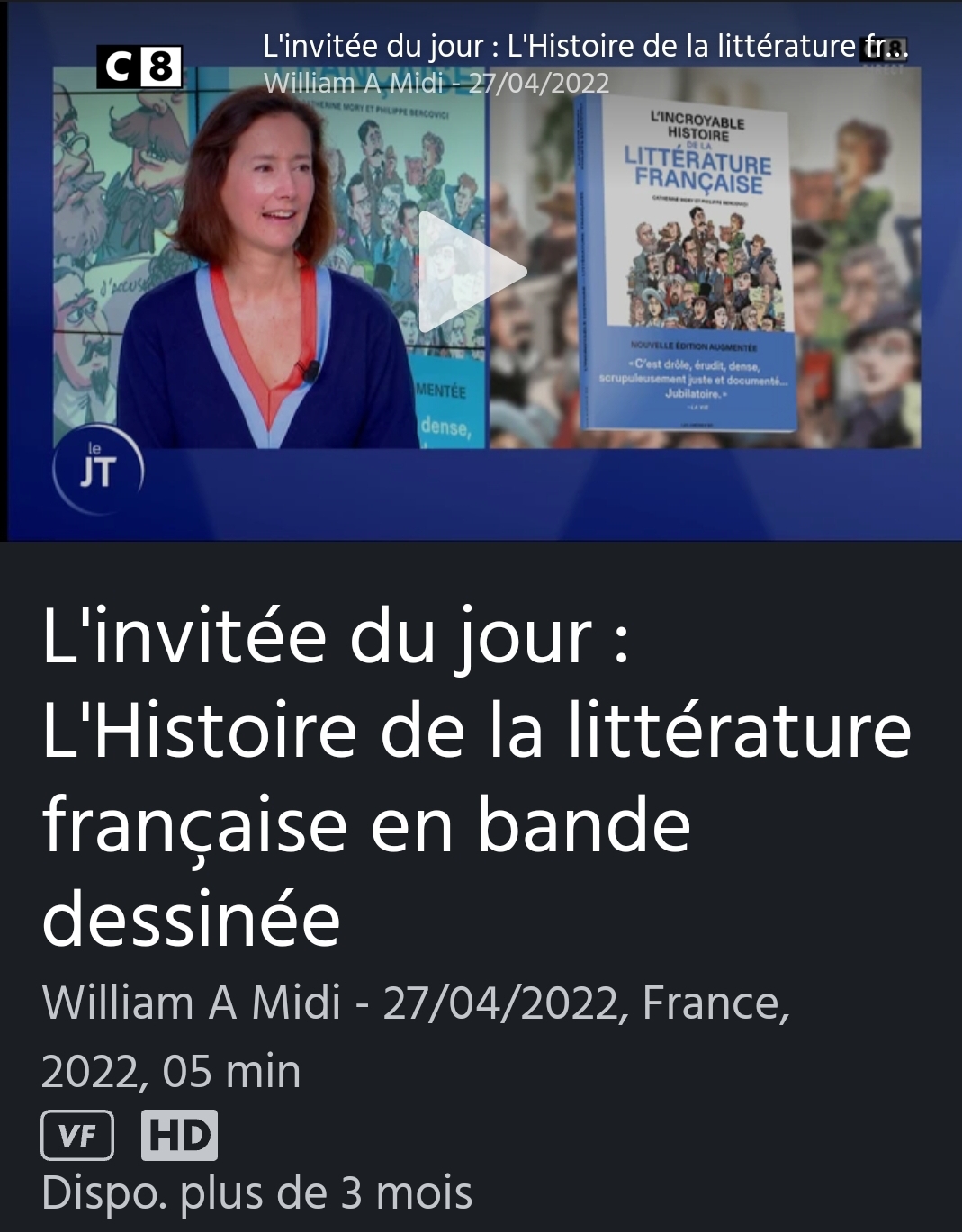 Aujourd’hui 27 avril, Catherine était l’invitée de William Leymergie sur C8, dans l’émission William à midi, pour parler de la nouvelle édition de l’incroyable histoire de la littérature française.